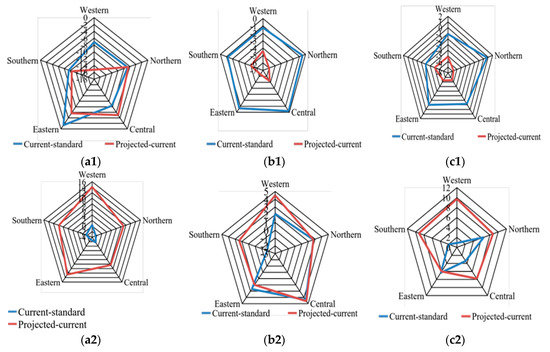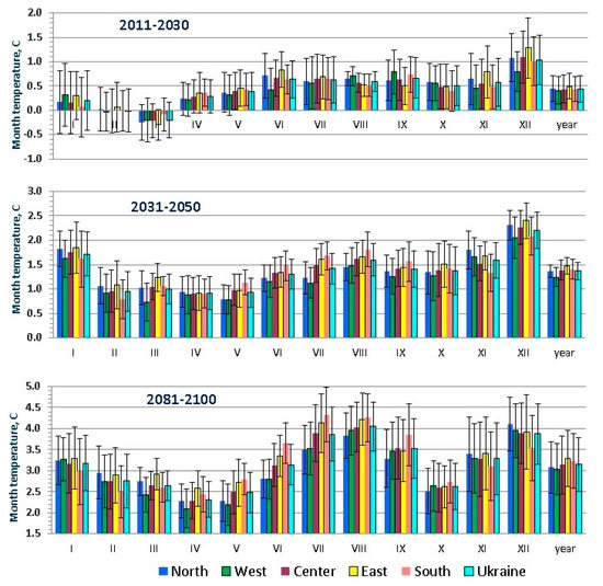 The projected changes of average temperature compared to 1991–2010 and their confidential intervals were calculated based on 10 RCM [54] for three periods and five regions (Figure 3). For 2011–2030, the projected changes of the thermal regime show tendencies to both warming and cooling. The cooling is most probably in March (up to −0.3 ± 0.3 °С in the east), while the noticeable warming is from June to end of the year with maximum in December at 0.8–1.3 °С ± 0.4–0.6 °С. On average, the projected range of the temperature change in Ukraine during 2011–2030 varies from −0.1 °С to 0.8 °С with the maximal values in north of the Eastern region.