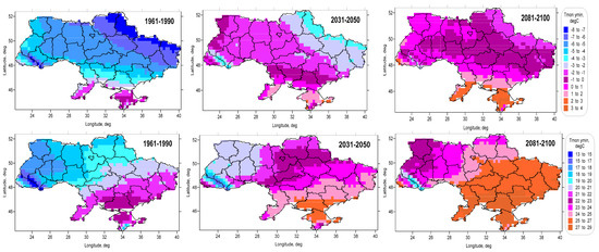 The increase of the annual temperature in Ukraine by end of the century (2081–2100) is expected on average to be +3.2 °С ± 0.6 °С. The largest warming is expected in the Southern region in summer (at +4.3 °С ± 0.6 °С in July when the average month’s temperature will reach 27.4 °С) and in the Northern region in winter (+4.1 °С ± 0.6 °С in December), and the minimal warming in April and October (Figure 3). Confidential intervals for this period are the largest, with the maximum for November for all regions and December for the Eastern region (±0.9 °С). Figure 4 shows temperatures in Ukraine of the coldest (January) and the warmest (July) months for standard period (1961–1990), by middle (2031–2050) and the end of the century (2081–2100). Significant warming is remarkable by both parameters: (1) the coldest month is an indicator of cryoclimate and it is obvious from Figure 4 that, by end of the century, the winter climatic season will disappear in Southern and some oblasts of Western and even Northern regions, because monthly averages will be higher than 0 °C; and (2) the warmest month as an indicator of potential evaporation shows the same significant increase over the entire territory and projected to be higher than 25 °C for more than half-country with maximum over 27 °C in Southern region.
