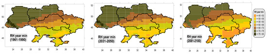 Minimal monthly means of relative air humidity (%) for 1961–1990, 2031–2050, and 2081–2100.