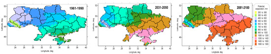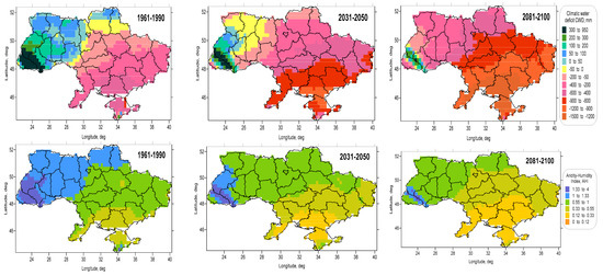 Potential evapotranspiration indicates expected levels of water stress. As shown in Figure 7, the potential evapotranspiration increase is large over the entire country and most dramatically in its southern part, reaching by the end of the century above 1600 mm year−1 under precipitation of 300 mm year−1. This results in negative climatic water deficit over almost the entire territory of Ukraine by the middle of the century, reaching −1000 mm year−1 over the warmest and driest part in Kherson oblast and AR Crimea. CWD increases of some additional hundreds of millimeters by the end of the century causing shifting in bioclimatic zones of one category to drier climate, as the aridity–humidity index by Vysotsky–Ivanov shows (Figure 7). Actually, territory with semi-arid climate (0.33 < AHI < 0.55) in standard period (1961–1990) becomes arid (0.12 < AHI < 0.33) by 2031–2050 and dramatically enlarges by 2081–2100 in Southern region. At the same time, by the end of the century (2081–2100), the territory with humid climate (1 < AHI < 1.33) in standard period (1961–1990) converts to semi-humid (0.55 < AHI < 1) in Western and Northern regions, and semi-humid areas to semi-arid areas in Central and Eastern regions. Territory with extra-humid climate (AHI > 1.33), which widely surrounded the Carpathian Mountains in the standard period (1961–1990), will shrink significantly by 2031–2050 and almost disappear by the end of the century (2081–2100), remaining just over the highest peaks (Figure 7). Summarizing, significant changes in temperature and precipitation will definitely impact biodiversity and particularly require sustainable forest management with corresponding effective measures.