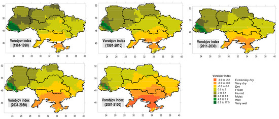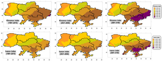 Indexes of climate continentality by Ivanov and Khromov were calculated for the above five periods. Examples for the recent period (1991–2010), middle (2031–2050) and the end of the century (2081–2100) are shown in Figure 11. The boundary between values of Ivanov index of 100% means boundary between oceanic (<100%) and continental (>100%) climates. As it follows from the dynamics of these indicators, both indices project some weakening of continentality in southeastern part by the middle of the century. Overall, change of the climate continentality is substantial by the end of the century. However, this indicator will not play a notable role in future dynamics of forests because it is basically within the limits of tolerance of major forest forming species of Ukrainian forests to continentality.