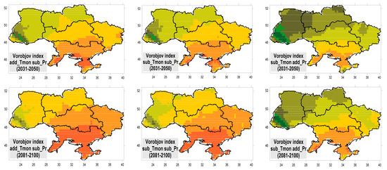 Dynamics of forest climatic zones by Vorobjov for the five periods according to Scenario A1B and some combinations of temperature/humidity for the last two periods for Scenario A1B±T±P are presented in Figure 8. As has been shown [43], the forest-climate types from very wet to fresh are the most suitable for growth and development of forests in Ukraine. Under dry climate, forests are able to grow in sites that have enough water supply. Natural forests are not able to grow in very dry climate (that is, the current climate of Crimea steppe). Extreme dry climate is a climate of semi-deserts. Realization of the balanced climate change scenario А1В supposes increasing drought across all territory of the country compared to the standard climatic period. Suitable forest-climate types will shift towards north. By end of the century, the area that would have conditions favorable for growth of forests (zones of humidity from very wet to fresh) will significantly decrease: such conditions in previously fresh climate will remain only in Western and Northern regions, and in small areas in the Central region. The drier conditions, which are typical for the steppe zone, will be formed over the rest of the plain territory of Ukraine. While in the current climate the very dry climate comprises 9.8% of the flatland territory of the country, its share will already increase to 21% in 2031–2050. Within the considered scenario, a new type of climate is expected by the end of the century—the extremely dry type, which will envelope a significant area of southern Ukraine—Crimea’s steppe, coastal steppe of Odessa, Mykolaiv and Kherson oblasts and partially Zaporizhja oblast (totally, about 15% of the country’s area). Such changes will cause a shift of bioclimatic zones: conditions that are favorable for forest-steppe vegetation will be formed in the north, for steppe vegetation over the rest of the territory, and for vegetation of semi-deserts in the south.