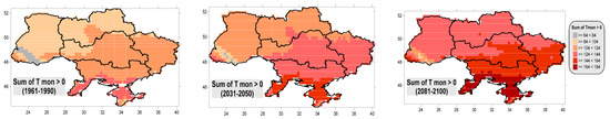 Dynamics of sums of positive monthly temperatures (indicator of heat availability by Vorobjov) for 1961–1990, 2031–2050 and 2081–2100 (Scenario A1B).