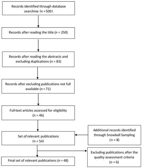 Next, we performed a quality assessment procedure, using a ten-question checklist [] (see Appendix A). Up to two points were assigned to each question, for a maximum possible score of twenty points per paper. Articles that scored less than fourteen points or scored zero in three or more questions were excluded, comprising a final sample of 48 articles (see Appendix B).