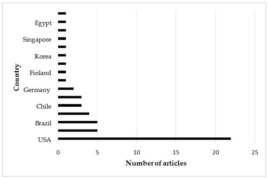 The United States clearly concentrates research in this subject: over 40% of the collected studies collected in our SLR were produced by US-affiliated authors (Figure 3). Australia, Brazil, the United Kingdom, Chile, and New Zealand follow the American lead, and together represent 37% of published studies.
