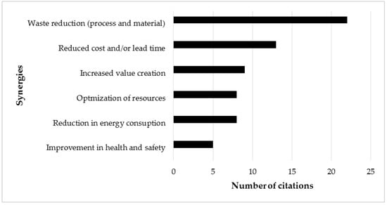 Six synergies were most frequently cited in the reviewed studies: (i) waste reduction; (ii) reduced cost and lead-time; (iii) increased value creation; (iv) optimized resource use; (v) reduced energy consumption; and (vi) improved health and safety (Figure 5). Waste reduction was the most cited synergy, corroborating results from [], which surveyed the UK’s construction sector professionals. However, is important to mention that, from the lean perspective, ‘waste reduction’ refers to reducing and/or eliminating activities that do not add value to the customer, while from the sustainability point of view, it is related to resources savings.