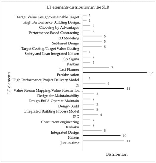 As to distribution of LT elements across the literature sample, Prefabrication [17 mentions], Value stream mapping and Just-in-time [11 mentions each], and Kaizen [10 mentions] had the highest occurrence frequencies registered by the SLR (Figure 6).