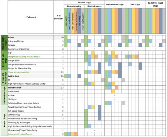 Lifecycle mapping of LT elements along a building’s lifecycle, considering the top six synergies found in the SLR: waste reduction (process and materials); reduced cost and/or lead time; increased value creation; resource optimization; reduced energy consumption; and improved health and safety. For reference purposes, ‘x’ represents elements related to less frequently mentioned synergies.