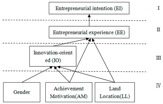 is at Layer IV, which form an influencing factor chain with logical relationships. Then, using a directed edge to connect the factors between adjacent layers and at the same layer, this study obtains the hierarchical structure of influencing factors of landless peasants’ EI, as shown in Figure 2.