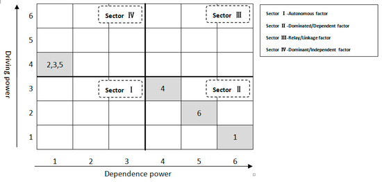 (3) The layer of influencing factors is determined. First, the highest layer factors are determined, and the reachable matrix is divided into a reachable set and an antecedent set , as shown in Equation (4). represents a collection of all of the factors that can be reached from the factor of the reachable matrix and represents a collection of all of the factors that can be reached in the .