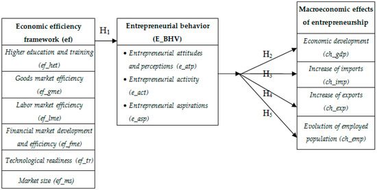 The proposed model regarding the entrepreneurial process is an extension of the Global Entrepreneurship Monitor (GEM) model [1,2,24]. Starting from some design specific principles of the reference model (GEM), the developed conceptual model of the entrepreneurial process only considered the entrepreneurial behavior of individuals in the moment of starting and running a business. The conditions of the economic efficiency framework influence the entrepreneurial behavior that generates macroeconomic effects on the level of economic development, international affairs and the growth of the employed population in the European area. The originality of the research model is generated by the expansion of the scope of the macroeconomic effects of entrepreneurship and their study from a longitudinal time lagged perspective.