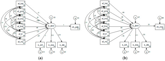 Considering the results of modeling four-year lagged effects on the growth of exports of goods and services (Model 3), the next influences are essential: a direct and significant negative relationship (p = 0.014 < 0.05, β = −0.703) between higher education and continuing training (ef_het) and entrepreneurial behavior (E_BHV); a positive and direct positive relationship (p = 0.007 < 0.05, β = 1.044) between the efficiency of goods market (ef_gme) and entrepreneurial behavior (E_BHV); positive, direct and significant relationships (pe_asp = 0.002, pe_atp = 0.000 < 0.05, βe_act = 1 * constrained, βe_asp = 3.193, βe_atp = 2.804) between entrepreneurial activity (e_act), entrepreneurial aspiration (e_asp), entrepreneurial attitude and perceptions (e_atp) and entrepreneurial behavior as latent variable (E_BHV); and a positive and significant relationship (p = 0.011<0.05, τ = 1.332) between the entrepreneurial behavior (E_BHV) and increase of exports, as a dependent variable (ch_exp). Therefore, hypothesis H1 is partially valid and hypothesis H4 is valid.