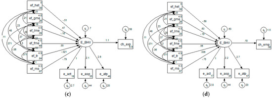Structural equation models in the case of export and employment rate growth, as potential effects of entrepreneurship: (c) growth in exports; and (d) increase of employment rate.