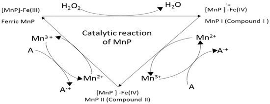 The catalytic cycle of MnP is similar to that of LiP (Figure 5). Like LiPs, MnPs are also heme-containing glycoproteins which require H2O2 as an oxidant. Manganese acts as a mediator during MnP enzymatic activity. To begin with, MnP oxidizes Mn2+ to Mn3+. The enzymatically generated Mn3+ oxidant is freely diffusible and participates in the oxidation reaction as a redox couple [72].
