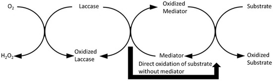 Mediators are low molecular weight compounds that are easily oxidized by Lacs and subsequently reduced by the substrate. Due to its large size, the substrate cannot reach the active site of the enzyme. A mediator, due to its small size, acts as a conveyer of an electron from the enzyme to the substrate [93]. The mediator reaches the enzyme active site easily and gets oxidized to a more stable intermediate with a high redox potential. The oxidized mediator diffuses away from the enzyme and oxidizes more complex substrates before returning to its original state [94]. The electrons taken by Lacs are finally transferred back to oxygen to form hydrogen peroxide [95,96].