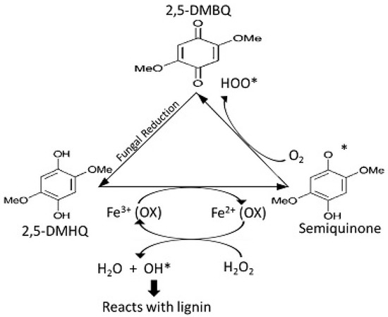 A detailed mechanism of the Fenton reaction has been explained using two extracellularly produced quinones, 2,5-dimethoxy-1,4-benzoquinone (2,5-DMBQ) and 4,5-dimethoxy-1,2-benzoquinone (4,5-DMBQ), in Gloeophyllum trabeum [80]. The two hydroquinones have the ability to reduce ferric oxalate salt to ferrous oxalate. In the second step, ferrous oxalate reacts with hydrogen peroxide to generate highly reactive hydroxyl free radicals. This reactive hydroxyl free radical can react with many organic compounds including lignin. Quinone is then converted back to hydroquinone by fungi [103].