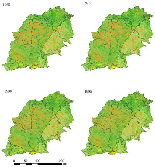 In this study, we used multisource satellite images to determine long-term LUCC in the MUSL and attempted to address the following points: (1) the process of LUCC in the MUSL from 1965 to 2015; and (2) the relationship between LUCC and different government policies from 1965 to 2015 in the study area.