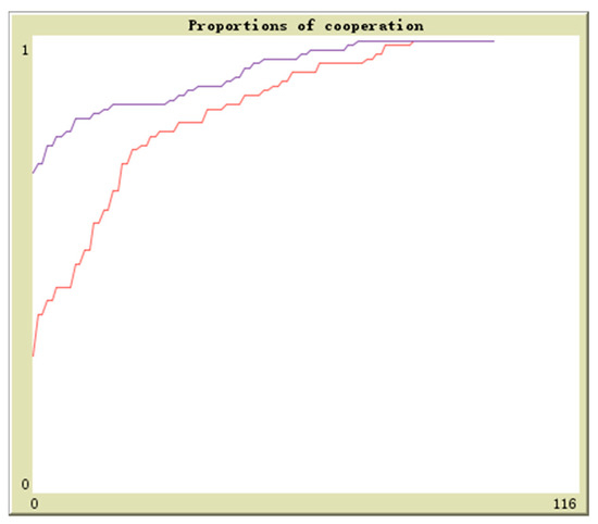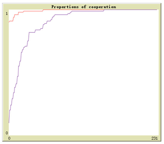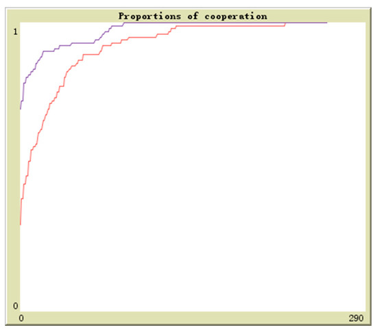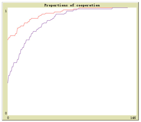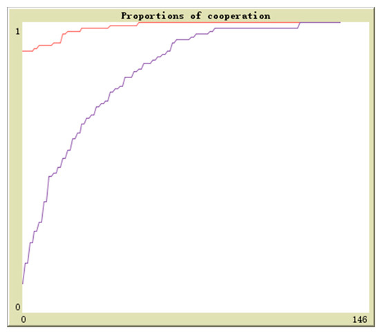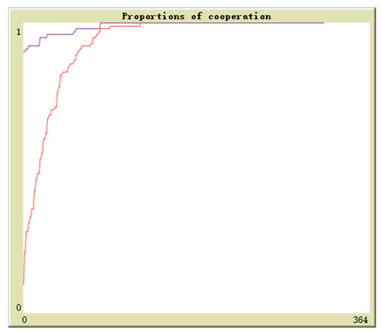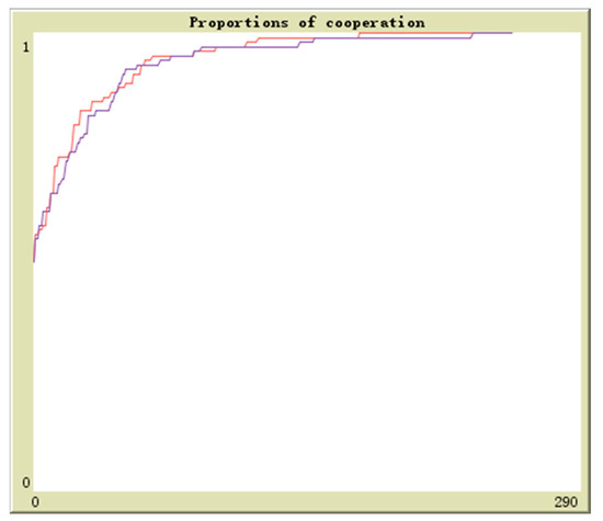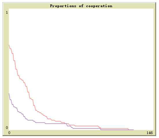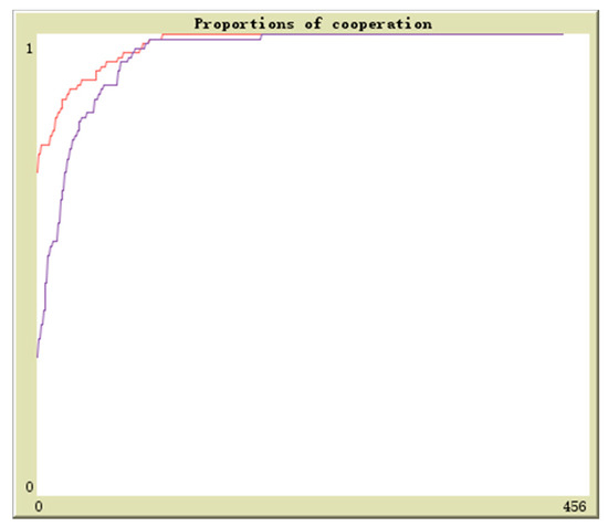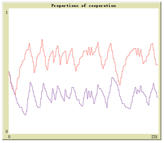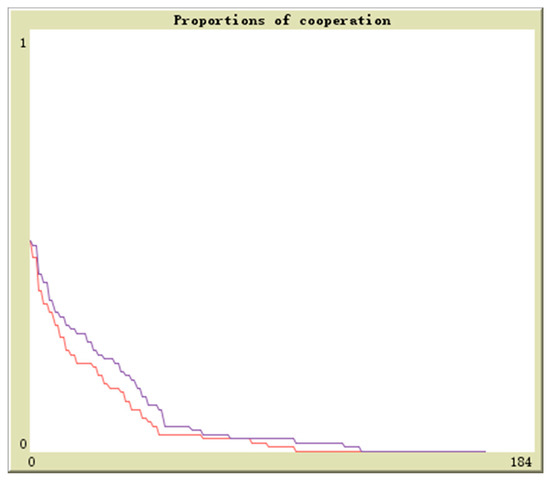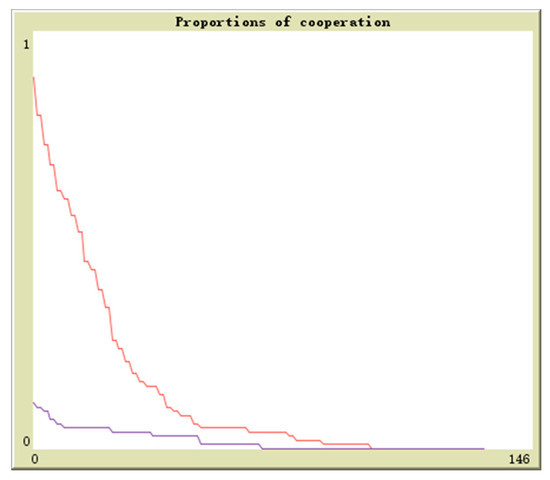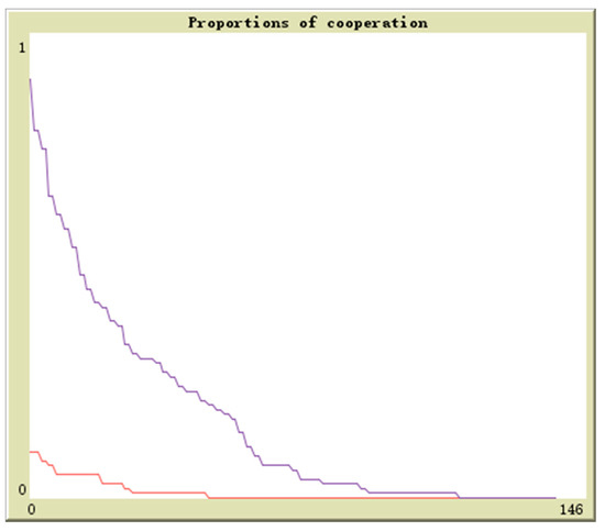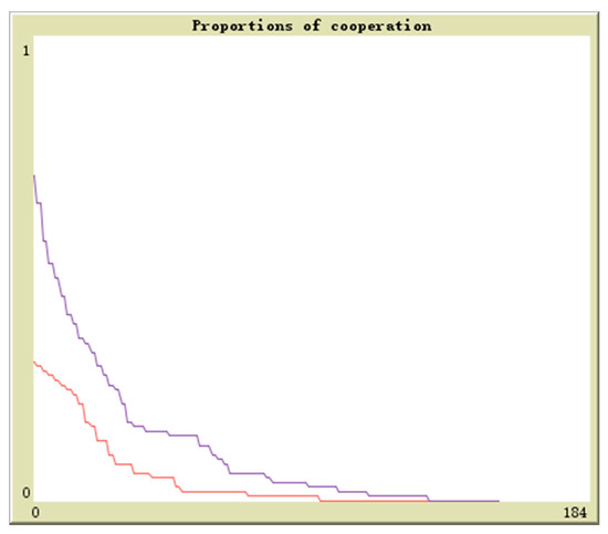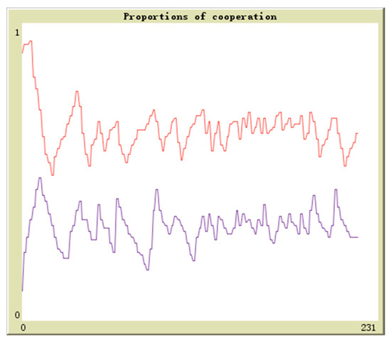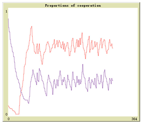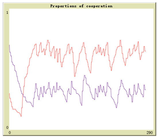 Suppose in population 1 there is q proportion of enterprises to adopt the cooperation strategy and in population 2 there is r proportion of enterprises to adopt the cooperation strategy, the initial values are (0.1,0.9), (0.3,0.7), (0.5,0.5), (0.7,0.3), (0.9,0.1). The horizontal axis and vertical axis is experiment time and cooperation proportion. The red curve denotes the proportion of q and the blue curve denotes the proportion of r. By simulation, the results of above analysis are further verified. The evolutionary paths from different initial values to the equilibrium points are shown in Figure 16, Figure 17, Figure 18, Figure 19 and Figure 20.