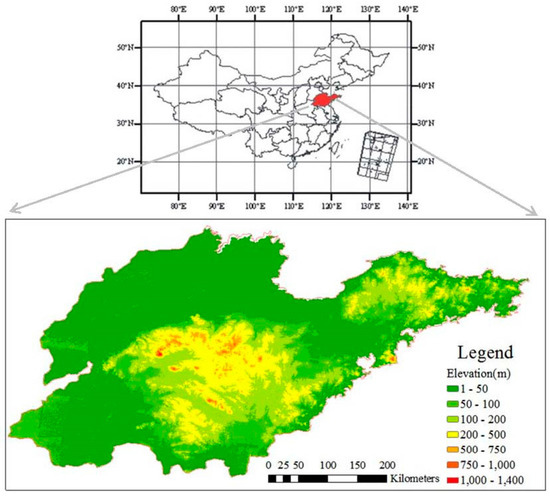 Shandong Province is located on eastern coast area of China, which is the lower reach of the Yellow River (the middle and northern part of Beijing). The Hangzhou Great Channel runs through Shandong Province. Shandong mainly consists of plain and hilly area, which occupies 55% and 28.7% of the total land area, respectively. This is located in the Middle and South Shandong. The northwest area includes the Northwest Plain of Shandong, an alluvial plain formed by the Yellow River. The eastern peninsula is mostly gently fluctuating hilly areas (Figure 1). Shandong has a semi-humid monsoon climate in the warm temperate zone. The climate is mild, and four seasons are discernible. The mean annual temperature is 11–14 °C. The mean annual precipitation is 550–950 mm. Shandong Province is an important agricultural production area in China. Cropland is distributed extensively, being found mainly on the Northwest Plain, Southwest Plain, and Jiaolai Plain. Forest and grassland are mainly distributed on the mountain, and hilly areas in Middle and South Shandong, Jiaodong Peninsula, and the Yellow River Delta. Wetland occurs mainly along the coast (Figure 2).
