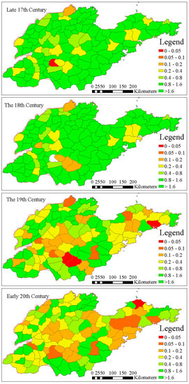 From the spatial distribution map of the pressure index on cropland in Shandong from the late 17th century to the beginning of the 20th century (Figure 6), it was found that the pressure index on cropland showed a similar spatial distribution to cropland area per capita, and its threshold was lower than that in modern times. The pressure index on cropland distributed homogeneously. It was relatively lower in the 17th–18th century and increased during the 19th–20th century.