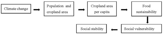 A warm climate was beneficial to driving an increase in population and agricultural development, which finally resulted in increasing pressure on the sustainability of cropland use. This increase in pressure on cropland was also related to the growth of the population as well as the spatial differences in land quality between plain and hill areas. The impacting process of climate change was sketched as following the flowchart shown in Figure 7: climate change—population and cropland area—cropland area per capita—food sustainability and society vulnerability—social stability.