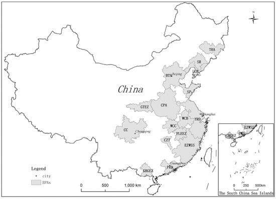 The identification of megaregions and evaluation of their development levels build on a combination of four functional categories including command and control, economy, humanities and innovation with 16 indicators. In general, a total of 16 EPAs are thus identified [,,]: (1) the Yangtze River Delta (YRD), (2) Beijing-Tianjin-Hebei (BTH), (3) the Pearl River Delta (PRD), (4) the Central Plains Area (CPA), (5) the Economic Zone on the West Side of the Straits (EZWSS), (6) Chengdu-Chongqing (CC), (7) Shandong Peninsula (SP), (8) Shenyang Region (SR), (9) the Liaoning Coastal Belt (LCB), (10) Wuhan City Circle (WCC), (11) Wanjiang City Belt (WCB), (12) the Guanzhong Tianshui Economic Zone (GTEZ), (13) the Chang-Zhu-Tan city group (CZT), (14) Poyang Lake Ecological Economic Zone (PLEEZ), (15) the Tumen River Area (TRA), and (16) Guangxi Beibu Gulf Economic Zone (GBGEZ) (Figure 1). In this paper, we use the 16 EPAs as our basic spatial unit for evaluating ecological vulnerability and sustainable development strategy of China’s prospective megaregions. The development level score of China’s 16 EPAs see in Table 1.