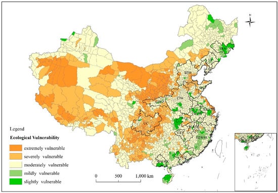 Ecological vulnerability in Mainland China. Data provided by Institute of Geographic Sciences and Natural Resources Research, Chinese Academy of Sciences (http://www.igsnrr.cas.cn/).