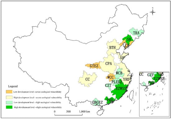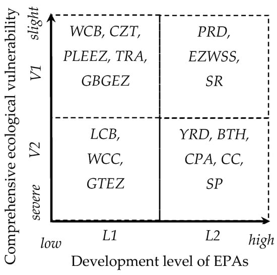 Typology of these megaregions based on their development level and ecological vulnerability. (Note: (1) Development level draws on overall score of Table 1, rankings 1–8 and 9–16 classified as L2 and L1, respectively. (2) Comprehensive ecological vulnerability on Table 2, rankings 1–8 and 9–16 classified as V2 and V1, respectively. (3) Abbreviations of EPAs refer to Table 1.)