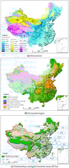 Second, maps of ecological indicators were collected from unclassified government bulletins and previous studies. These include the National key ecological function areas of China, the Available land resources per capita of China, the Available water resources per capita of China (data source from “National major function oriented zone planning” issued by the State Council of China, 2010) [], the Soil erosion map of China, the Ecosystem types distribution of China (sourced from the Data Center for Resources and Environmental Sciences, Chinese Academy of Sciences (RESDC), http://www.resdc.cn), the Desertification distribution map of China (sourced from Environmental and Ecological Science Data Center for West China, National Natural Science Foundation of China, http://westdc.westgis.ac.cn), and the Rocky desertification land distribution in the Karst regions of China (sourced from “Rocky desertification bulletin of China”, issued by the Forestry Bureau of China, 2012).