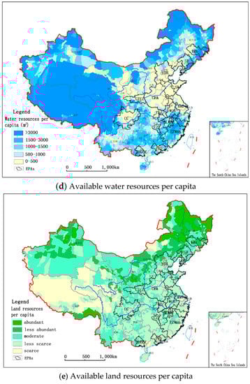GIS maps of various aspects of ecology in China’s EPAs. (Note: (1) Area of available land resources = area of land suitable for construction–area of existing construction land–area of basic farmland; (2) Figure 6a and Figure 6b are source from the Data Center for Resources and Environmental Sciences, Chinese Academy of Sciences (RESDC) (http://www.resdc.cn) ; Figure 6c, Figure 6d and Figure 6e adopted from Figure 11, Figure 2 and Figure 3 in “National major function oriented zone planning” issued by the State Council of China [])).