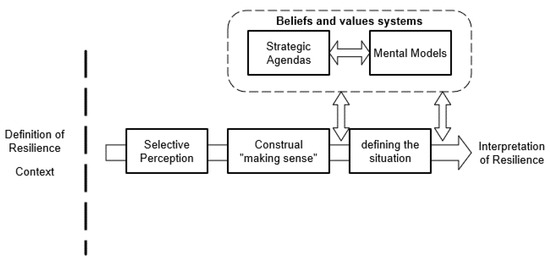The results were analysed in light of personal construct theory (PCT) [15]. PCT is based on the assumption that a person needs to make sense of the problem to address it: “a person’s processes are psychologically channelized by the ways in which he anticipates events” [30] (p. 7). Thus, to analyse resilience, stakeholders need first to make sense of what resilience means. To illustrate how this cognitive process unfolds, this paper adapts the simplified model proposed by Eden [31] to examine how stakeholders construct their own interpretations of resilience (see Figure 2). According to Eden’s [31] model, stakeholders make sense of the concept of resilience by selecting particular elements that are applicable to the problem at hand and its context. This perception is then filtered through the individual system of values and beliefs to articulate its own interpretation of what resilience means in practical terms. This separation of selective perception and construal follows the personal construct theory of Kelly [15].