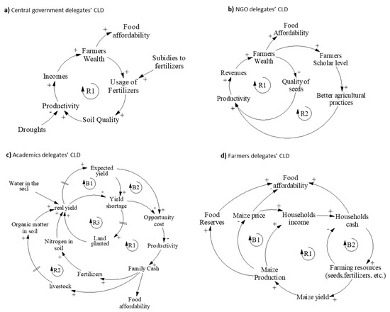 Causal loop diagrams (CLDs) explaining the decrease and fluctuations of maize affordability in Huehuetenango. CLDs were produced by (a) central government delegates; (b) NGO delegates; (c) academics delegates and (d) farmers delegates; during one-to-one semi structured interviews.
