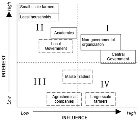 The power to influence the final outcome is not symmetrical among stakeholders, with those holding key resources being in an advantageous position to impose their own interpretations in the final scope. System adaptation will “influence social relations, governance and distribution of resources in any given population or place” [39] (p. 2). However, as shown in this case, there is not always agreement about the changes and the scale at which those changes should be made. Those with higher level of influence in the scope of analysis might not be those directly affected by its outcomes. For instance, the small-scale farmers in Huehuetenango are the stakeholders directly affected by potential decisions about how to enhance resilience, but they are also those with the least influence on the decision-making process (see Figure 5).