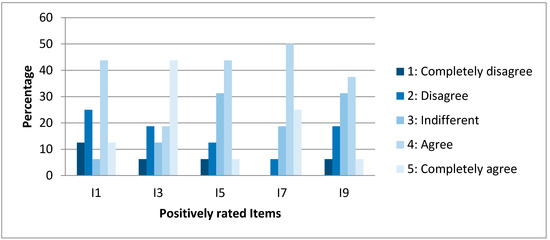 The odd-numbered items in the SUS questionnaire (I1, I3, I5, I7 and I9) express positive statements on the tool. Most of these scored 4 (agree with the statement), except for I3, which scored mostly 5 (completely agree) and includes the aspect of usability. In total, 56.25% of the respondents gave scores of 4 or 5 to I1; 62.5% to I3; 50% to I5; 75% to I7; and 43.75% to I9, which was the lowest rated in the set, and concerned security in the use of the tool (see Figure 3).