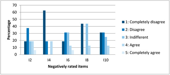 The even-numbered items in the SUS questionnaire (I2, I4, I6, I8 and I10) express negative statements on the tool. Most of these show two modes, with the exception of I2 which has a score of 2 (disagree with the statement) and I4, with a score of 1 (completely disagree). I2 assesses the complexity of the tool, and I4 the need for expert help. In total, 56.25% of the respondents gave scores of 1 or 2 to I2; 81.25% to I4; 50% to I6; 43.75% to I8; and 62.5% to I10, while I8 was the worst rated of the set. Over 50% believe the tool is inconvenient to use (see Figure 4).