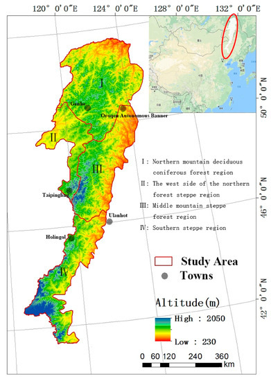 The Greater Khingan Mountain region (40°52′–53°33′ N, 116°25′–125°42′ E) is located in the northernmost region of China, one of the most sensitive areas to global climate change [20,21]. Estimating the net productivity of vegetation in this region is helpful in understanding the carbon sequestration capacity of the forest system in this area and understanding the climate change response mechanism. Thus, we can better predict the future trend of vegetation productivity and its impact on the carbon cycle, as it can be a reference for ecological compensation policy and sustainable forest development. For these reasons, we chose the Greater Khingan Mountain region as the study area and estimated the NPP with the purpose of verifying the applicability and accuracy of this model. The boundary of the Greater Khingan Mountain is defined by the eco-geographical region map of China [22], which divides the Greater Khingan Mountain region into four ecological regions: (I) the northern deciduous coniferous forest region; (II) the western side of the northern forest steppe region; (III) the middle steppe forest region; and (IV) the southern steppe region (Figure 1).