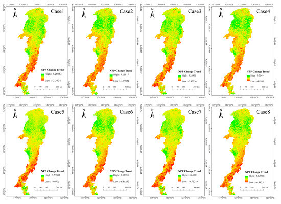 As seen from Figure 3, the area with decreasing NPP is significantly smaller than the areas with constant or increasing NPP. Three main distributions of the decreasing trend exist. The first one is the southeastern part of the Greater Khingan Mountains, which is located at the juncture of the Inner Mongolia Plateau and the Northeast Plains, west of the Hunshandake Sandy Land and east of the Kerqin Sandy Land. The forest coverage is low, and the ecological environment is poor. Additionally, urban areas are concentrated in this region, and destruction due to urbanization can also lead to a reduced NPP. The second one is the Hulunbuir Pasture Land, where desertification, transition grazing, and reclamation activities have led to a decrease in NPP in this region. The third one is near the city of Holingol. This city is a new industrial city in the hinterland of the Kerqin grassland. The fragility of grassland vegetation and the destruction of the ecological environment by mining development may be the main reasons for the decrease in NPP in this area.