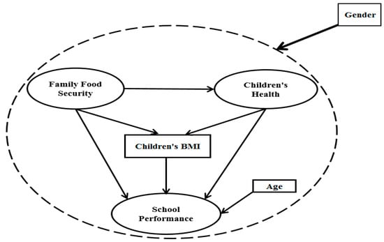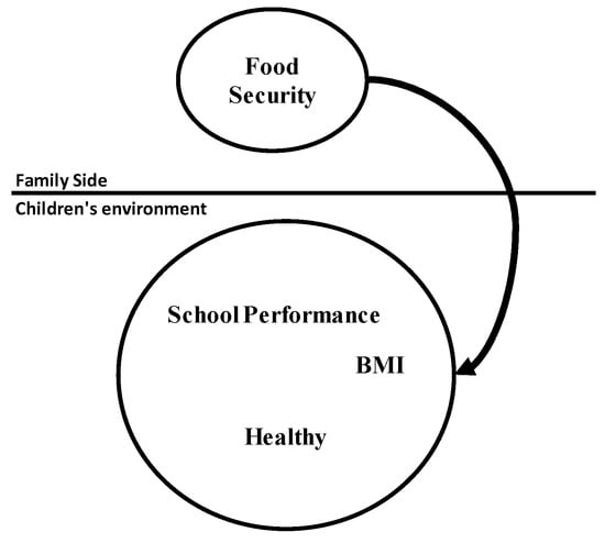 Food security is necessary for economic and social stability as well as sustainable development []. In the last two decades, food security has become one of the most discussed topics in specific studies, like energy [], agriculture [], and public health []. Food security has been considered by numerous researchers and is now recognized as a vital tragedy for human society owing to its growing prevalence. This concept has been addressed as a key in estimating children’s health [,], children’s BMI [], and children’s school performance []. However, there is lack of study considering the impact of family food security on the relationship among children’s BMI, children’s health, and their school performance.