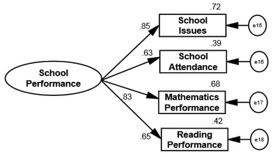 The last latent variable taken into consideration is children’s school performance. This latent variable is defined by four items. According to the results in Figure 4 and Table 3, the CFA model indicates adequate fit to the data collected based on [NFI] = 0.987, [CFI] = 0.990, [TLI] = 0.969, [RFI] = 0.960, [GFI] = 0.991, and [RMSEA] = 0.076. Moreover, the factor loadings of the four indicators are greater than 0.5. As a result, the children’s school performance measurement model is well-defined.