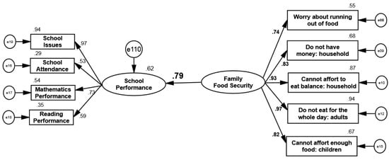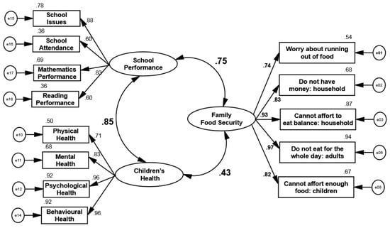 An attempt was made in this study to provide a valid and reliable model for measuring the effectiveness of family food security on children’s environment. Therefore, the main concern was to introduce and examine a causal association between family food security status and children’s BMI, health, and school performance by testing the hypothesized structural model. Confirmatory factor analysis was suggested as the primary analysis between family food security, children’s health, and school performance. The final analysis results delaminate non-significant indicators and introduce the significant indicators with acceptable factor loadings ranging from 0.59 to 0.97.
