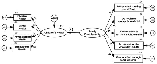 The first Hypothesis is tested to examine whether children’s health status as a dependent and mediator latent variable is related to family food security. This relation of family food security with children’s health exhibits perfect model fit to the given data ([NFI] = 0.959, [CFI] = 0.965, [TLI] = 0.951, [RFI] = 0.943, [GFI] = 0.929, and [RMSEA] = 0.071). As presented in Figure 6, family food security has a significant positive impact on children’s health (β = 0.43; p-value < 0.001). Therefore, children’s health is better with higher family food security.
