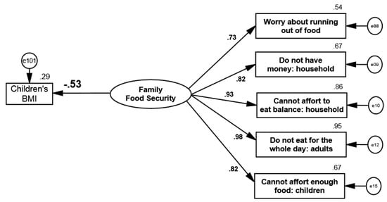 The second Hypothesis is tested to investigate whether family food security status is directly related to children’s BMI. This relation presents acceptable model fit to the given data ([NFI] = 0.980, [CFI] = 0.984, [IFI] = 0.984, [TLI] = 0.974, [RFI] = 0.967, [GFI] = 0.968, and [RMSEA] = 0.063). Figure 7 shows the impact of a latent variable over a measurement variable, which is one of the features of SEM techniques for modeling. As seen in Figure 7, family food security has a significant negative impact on children’s BMI (β = −0.53; p-value < 0.001). Therefore, families with high food security attempt significant control and achieve lower children’s BMI.