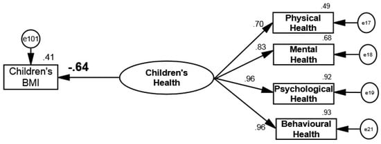 The fourth Hypothesis is analyzed to test the relation between children’s health and their BMI. This relation exhibits good model fit to the data ([NFI] = 0.982, [CFI] = 0.984, [TLI] = 0.968, [RFI] = 0.963, [IFI] = 0.984, [GFI] = 0.972, and [RMSEA] = 0.036). According to Figure 9, children’s health status (β = −0.64; p-value < 0.001) is directly related to children’s BMI. Figure 9 also indicates that children’s health status has a negative significant impact on children’s BMI, which is more likely to be lower.