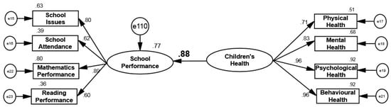 The fifth research Hypothesis is about understanding the direct connection between children’s health and children’s school performance. The results ([NFI] = 0.952, [IFI] = 0.958, [CFI] = 0.958, [TLI] = 0.938, [RFI] = 0.929, [GFI] = 0.927, and [RMSEA] = 0.019) show that the relation between children’s health and children’s school performance confirms adequate fit to the data. The results in Figure 10 illustrate a very strong, positive, significant association between the health status of children and their school performance (β = 0.88; p-value < 0.001).