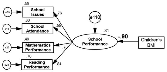 The sixth Hypothesis regards understanding the direct relation between children’s BMI and their school performance. The results ([IFI] = 0.868, [NFI] = 0.864, [CFI] = 0.867, [TLI] = 0.735, [RFI] = 0.729, [GFI] = 0.854, and [RMSEA] = 0.272) signify that the model of children’s BMI and school performance does not adequately fit the data. Figure 11 indicates a negative significant connection between children’s BMI and school performance (β = −0.90; p-value < 0.001).