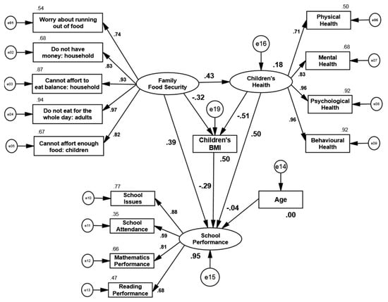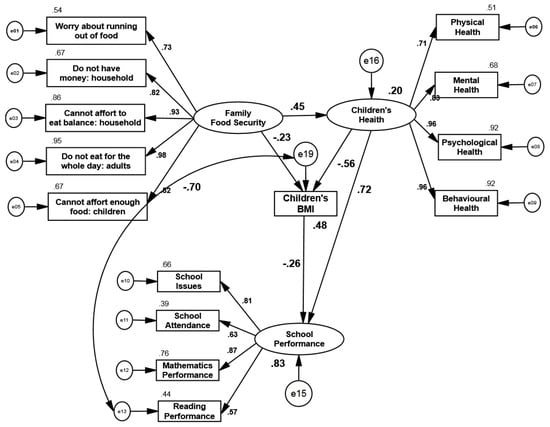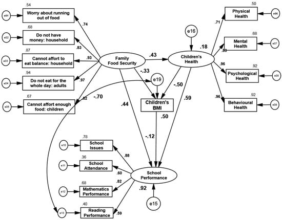 With the help of the model considered and due to the strong and significant association between the constructs, larger values of the variables’ shared variances were determined. Essentially, based on the findings, 92% of changes in children’s school performance can be justified by the family food security situation and children’s health along with children’s BMI. A structural model matching well to the acquired data indicates that the current integrated research model is in agreement with the associations within the acquired data. Studying the dimensional integrated model in order to assess the direct and indirect associations between the constructs was one of the key objectives of the present research. Despite the fact that the regression models in prior research could describe and determine the associations among constructs, they could not determine the direct and indirect associations and interactions between two mediators among the variables of interest. The results of the present research show that in spite of the direct association between children’s school performance and family food security, an indirect but meaningful relationship exists between family food security and children’s BMI through children’s health. Parents with higher food security levels seemed to have children with lower BMIs as well as healthier children. As a result, their children appeared to have a normal BMI and weight. In other words, family food security is not only directly associated with the BMI condition of children but can also indirectly impact their BMI through an influence on children in terms of health condition. Likewise, the mediating role of BMI and children’s health-related well-being, and their interaction, have not been considered in previous studies.