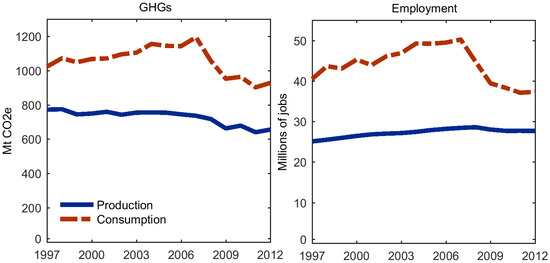 The UK is a net importer of embodied emissions, since it imports more emissions than those it exports. Similarly, the UK is a net importer of employment embodied in traded goods. Hence, the amount of employment that it creates in foreign countries via international trade is greater than the amount of employment that is generated by its local export sectors. This can be clearly appreciated in Figure 1, in which the consumption curves (i.e., GHG and employment footprints) lie above the territorial ones (herein referred to as production). The space between both types of curves represents the net transfer of both emissions and labour embodied in trade flows.