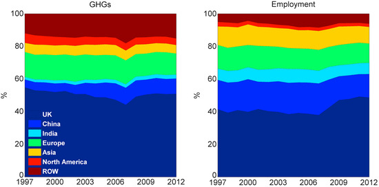 The GHG and employment footprints can be regionally decomposed with the purpose of determining the geographical areas where emissions and employment are created to satisfy the UK’s needs. In relation to GHGs, around half of the emissions were generated within the UK during the period of study, as can be seen in Figure 2. However, domestic emissions showed a gradual decline, reflecting an increasing dependency on imports. Domestic emissions represented around 55% of the total footprint in 1997 and went down to 44% in 2007. However, given the decline in imports registered during the financial crisis, their share increased again to 51% in 2012.