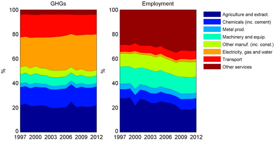 It is important to mention that in some cases several determinants might not be independent from each other. Dietzenbacher and Los [57], in this regard, warn that SDA should be treated with caution, since the technique assumes that the determinants are independent. In this analysis, it cannot be expected that a change in intensities (i.e., Δ) can occur independently of the technology matrix used to calculate L. Dietzenbacher and Los [57] propose a solution, but it is seldom applied. In fact, only few studies highlight this matter [58,59]. There is not a straightforward solution to rearrange the terms so as to avoid dependency problems, and we acknowledge that this issue might affect the SDA results presented in this paper by not completely isolating the effects derived from changes in intensity and industrial structure.