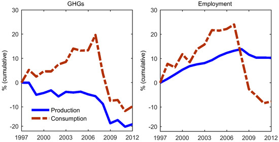 Cumulative change in GHGs and employment (production and consumption).